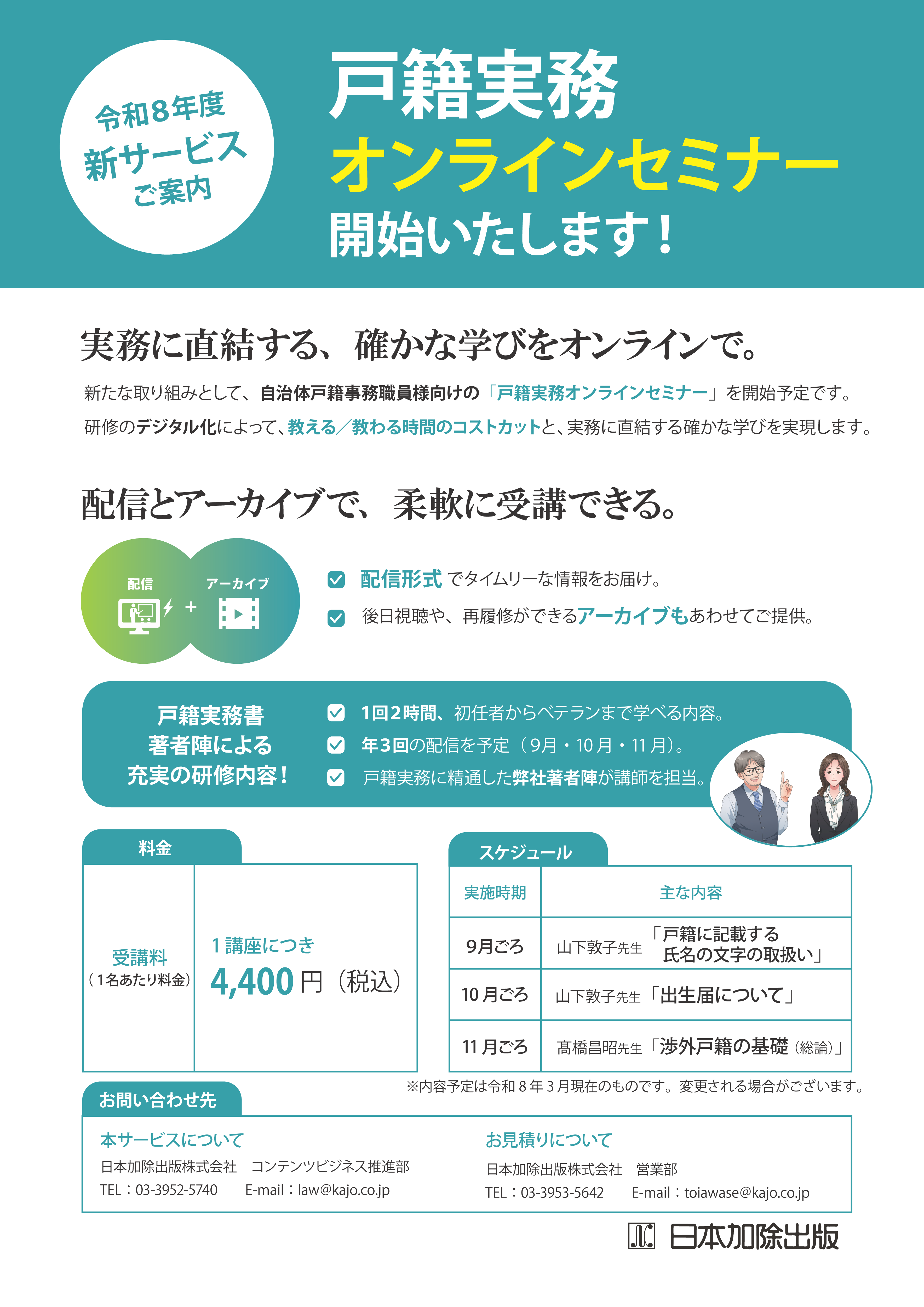 【令和8年度予定】新サービス・戸籍実務オンラインセミナーのご案内 弊社では、長年にわたり全国各地の戸籍事務協議会はじめ、 戸籍実務担当者の皆様が集まる機会に著者を講師としてご紹介させていただいておりましたが、 令和8年度より、自治体戸籍事務職員様向けの「戸籍実務オンラインセミナー」を開始予定です。 令和8年度予算編成の際には、本セミナー受講をご検討いただければ幸いに存じます。 戸籍実務オンラインセミナーを開始いたします! クリックするとPDFが開きます。 スケジュール 本セミナーは令和8年度(2026年4月以降)実施予定です。 ※内容予定は令和8年3月現在のものです。変更される場合がございます。 実施時期 主な内容(予定) 価格(税込) 2026年9月ごろ 山下敦子先生「戸籍に記載する氏名の文字の取扱い」 4400円 2026年10月ごろ 山下敦子先生「出生届について」 4400円 2026年11月ごろ 髙橋昌昭先生「渉外戸籍の基礎(総論)」 4400円 料金 受講料(1名あたり料金) 1講座:4400円(税込) 3講座すべて:13200円(税込) ※1講座から受講可能です。 ※複数名でのお申し込みの場合は、1講座につき人数×4,400円(税込)がかかります。 Q&A Q:1回分のセミナーの所要時間は? A:2時間を想定しています Q:オンラインセミナーに接続する方法は?(視聴方法は?) A:Zoomを想定しています。 (Zoomで対応できない場合はご相談ください) Q:オンラインセミナーの詳細情報はいつ案内されますか? A:具体的なセミナー情報や講師などの情報は、2026年4月までにご案内をする予定です。 Q:3つあるセミナーのうち、ひとつだけ受講することはできますか? A:3つのオンラインセミナーはぞれぞれ個別に受講いただくことが可能です。 Q:申込みをしたいのですが、どうしたいいですか? A:2026年4月にお申込み受付を開始します。 また、申し込みの方法は、フォームに記入いただく方法、申込書をFAXでお送りいただく方法を用意する予定です。 Q:申し込みはいつまでにすればよいですか? A:各オンラインセミナー開催日の1週間前までにお申込みください。 動画サンプルのご案内 弊社では、オンラインセミナーと並行して、戸籍実務者の皆様の研鑽に資する研修動画の開発を進めております。 このたびお問い合わせのみなさまにはオンラインセミナーとあわせてご活用いただきたく、サンプル動画のリンクを記載させていただきました。 サンプルではございますが、日々の実務やスキル向上にお役立ていただければ幸いです。 お問い合わせ先 本サービスについて 日本加除出版株式会社 コンテンツビジネス推進部 TEL:03-3952-5740 MAIL:law★kajo.co.jp お見積りについて 日本加除出版株式会社 営業部 TEL:03-3953-5642 MAIL:toiawase★kajo.co.jp (★を@にしてください) PAGE TOP